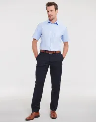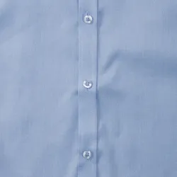 ·130 g/m² (White: 125 g/m²)·84% pamut, 16% poliészter (apró halszálkás mintázatú)·klasszikus anyag·félig levágott gallér·keskeny gombolópánt·testhezálló fazon·könnyen kezelhető.