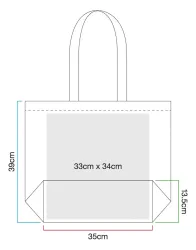 ·170 g/m²·100% pamut (újrahasznosított)·kézben és vállon is hordható·Kapacitás: 18 liter·Méret: 35 x 39 x 13,5 cm.